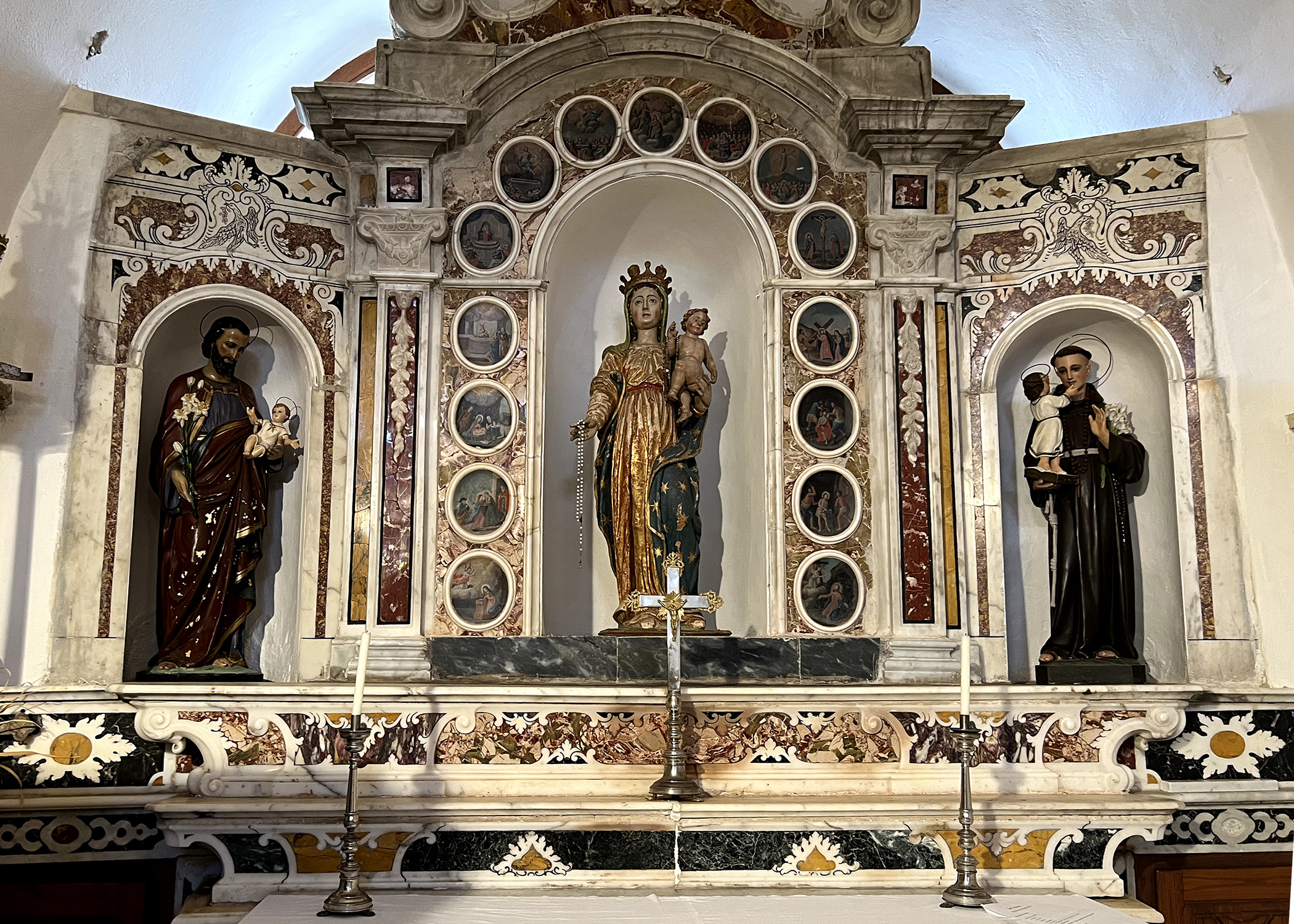 As you enter, just stop and look at the two antependia inlaid in the pietra dura technique, and get ready to be amazed at the sophisticated ability of artist Pietro Pozzu who managed to preserve the typical gracefulness of the vegetal world even in the rigidity of the marble. Both carved in 1725, they have two medallions at the centre, one dedicated to St Sebastian and one to the Virgin.