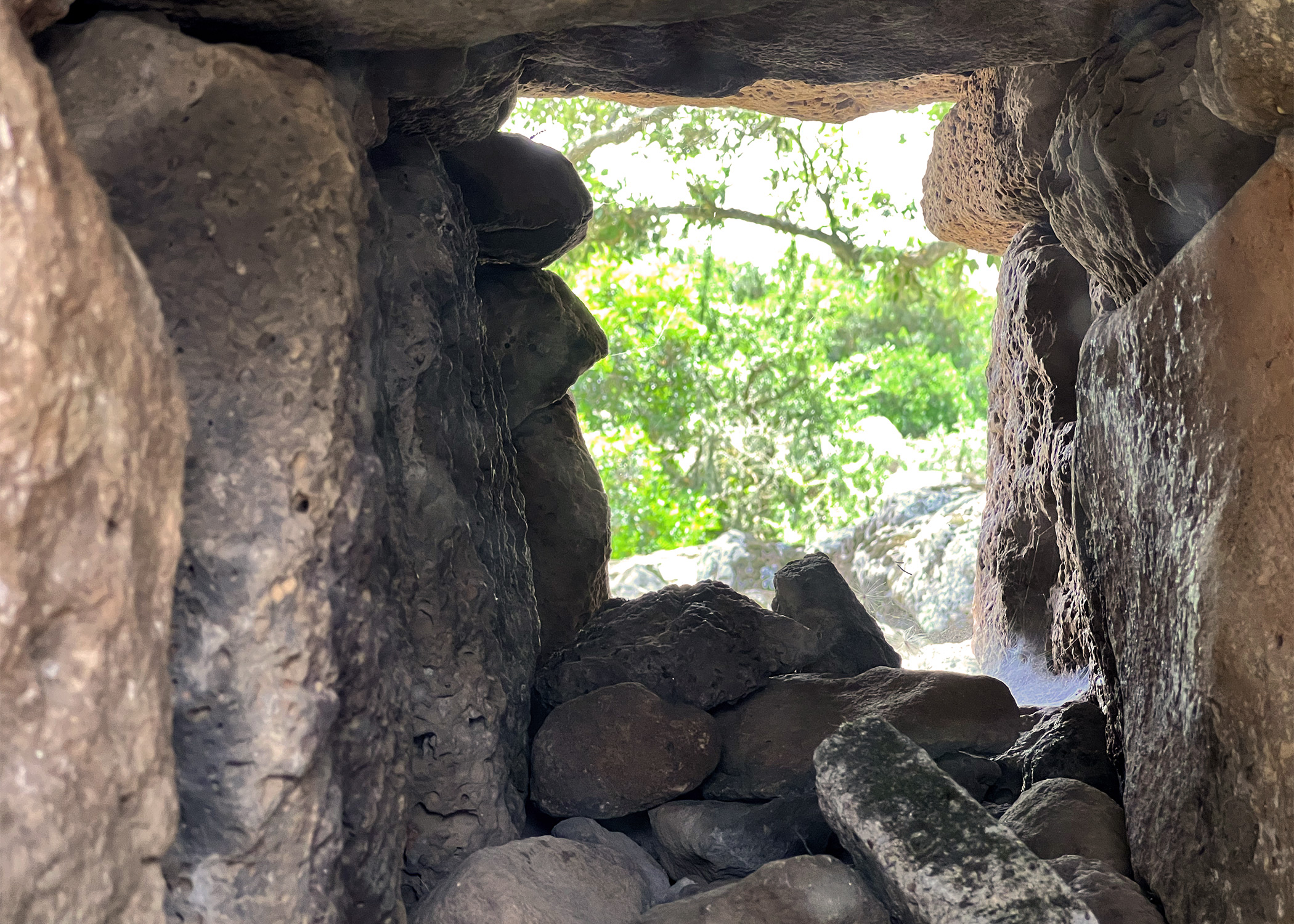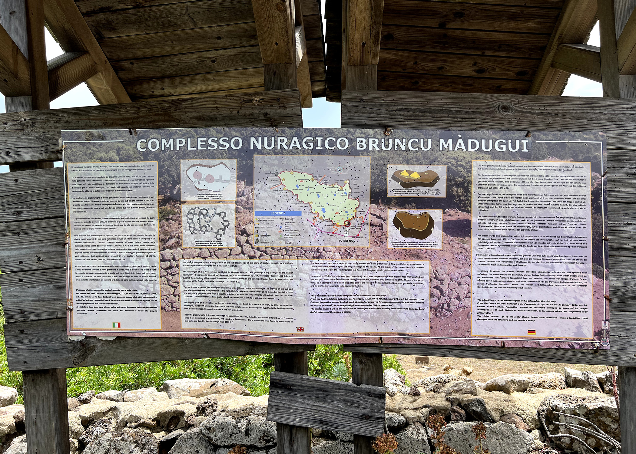 A poche centinaia di metri dall’ingresso, si trova uno tra i più antichi nuraghi rinvenuti in Sardegna, meglio noto come protonuraghe Bruncu Madugui (intitolazione locale) o Maduli (denominazione archeologica). Con Bruncu si intende una protuberanza o prolungamento della linea di costa mentre il toponimo Madugui attualmente non è stato ancora decifrato. Imponente per i suoi quattro metri di altezza, il protonuraghe si distingue dai più comuni nuraghi per la sua impostazione a corridoio, sebbene col tempo la planimetria sia stata complicata da aggiunte strutturali posteriori.
