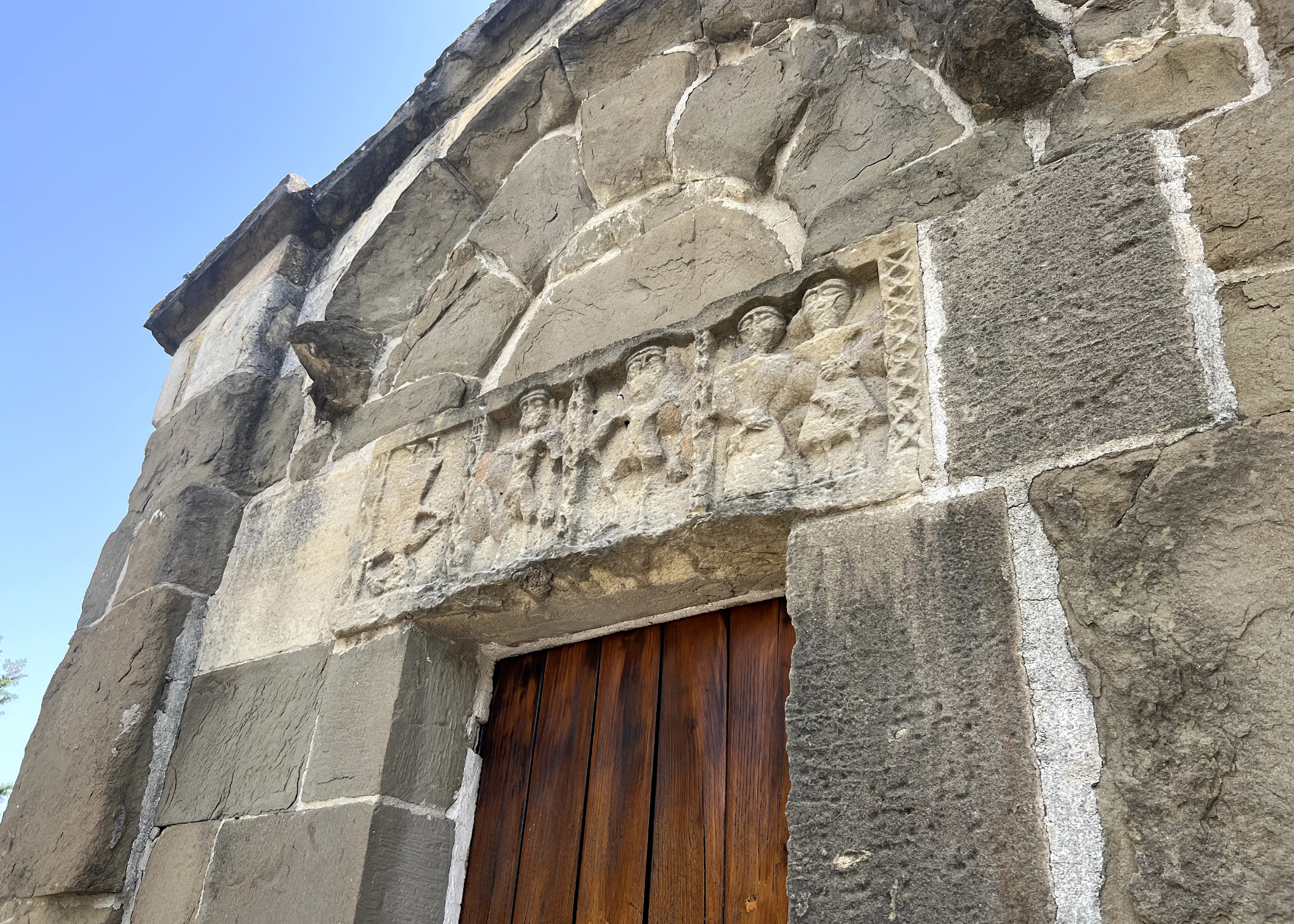 Dall’esterno, potrai osservare la deliziosa facciata movimentata dalla presenza di paraste angolari e lesene, per un risultato composto e sobrio dell’insieme. Avvicinandoti, potrai individuare il piccolo ma prezioso architrave del portale che mostra cinque figure antropomorfe scolpite in successione. La presenza fra queste di un singolare “capovolto” rende l’opera un unicum nel panorama scultoreo medioevale sardo ed è stato oggetto di diverse interpretazioni e studi. Tra queste, un’ipotesi molto suggestiva vuole che la più particolare tra le figure a rilievo, quella curiosamente capovolta, sia una rappresentazione di Lucifero, e che la coppia di figure all’estremità opposta indichi i personaggi di Adamo ed Eva; mentre le restanti potrebbero raffigurare l'arcangelo Michele, a cui la chiesa è dedicata, e Dio Padre, di maggiori dimensioni.