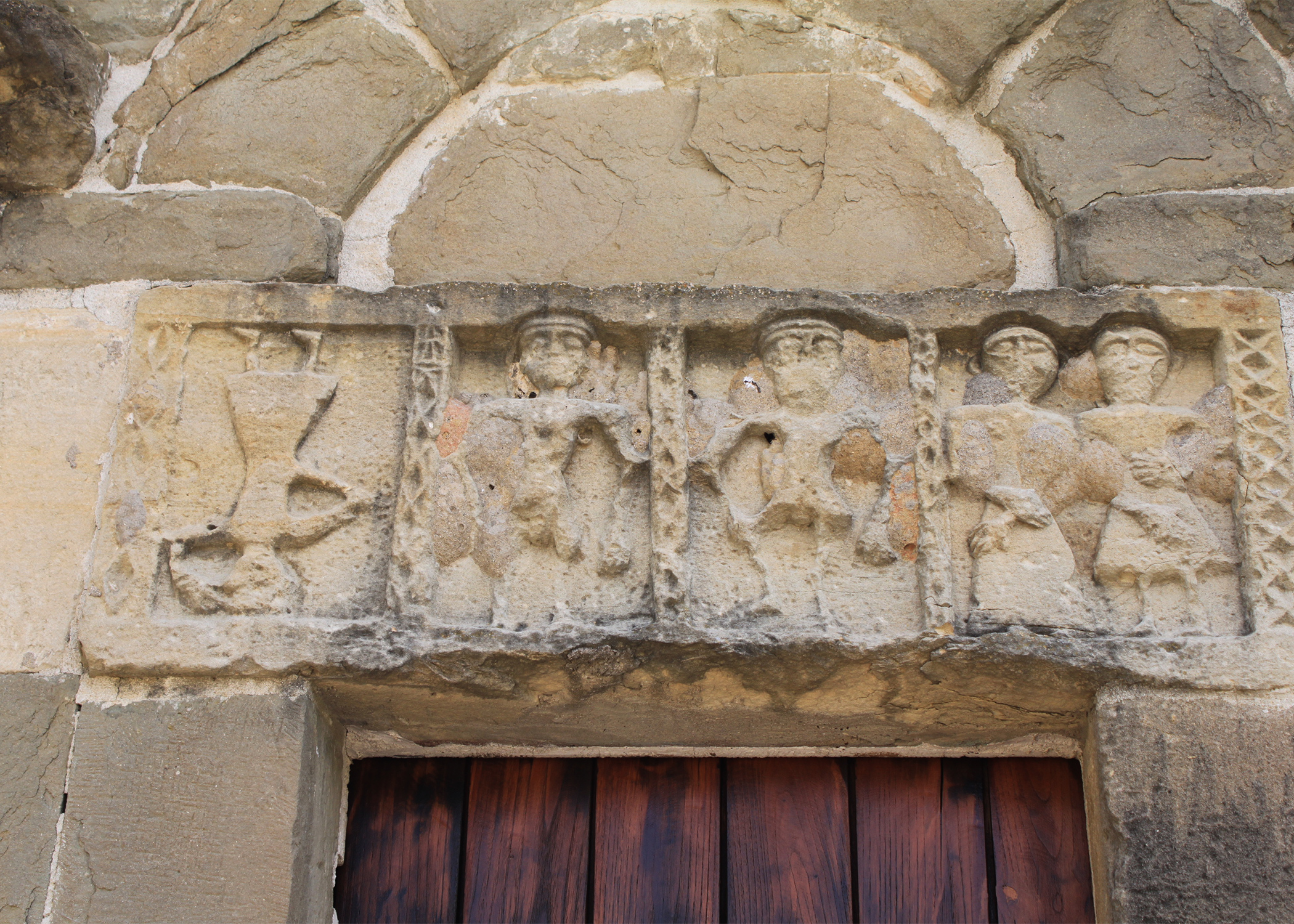 Secondo lo studioso Francesco Alziator, la cui interpretazione risulta più verosimile, la figura capovolta potrebbe rappresentare una persona morta, quindi scolpita in una dimensione diversa, opposta, rispetto a quella dei vivi, mentre le due figure centrali potrebbero rappresentare gli antenati importanti della persona morta e le due figure in coppia potrebbero essere i genitori o i parenti, che in suo onore ed in memoria degli antenati hanno realizzato la piccola chiesa. Secondo altri studiosi ancora il ciclo scultoreo rappresenterebbe una scena coreografica di ballo sardo (“ballo in tondo”), con la figura capovolta intenta a eseguire una capriola acrobatica (sa sciampitta). E così via.